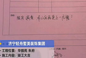 貴府的工程已全部圓滿竣工并通過了竣工驗收,感謝您在整個過程中對于我們的理解、支持和包容。輕舟美住裝飾張興魯工作室提前恭賀您和家人喬遷新居,恭祝您和家人生活幸福美滿、事業(yè)蒸蒸日上。